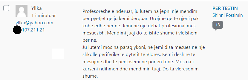 Dhe këtë e keni bërë në një faqe që administrohet prej meje, prandaj mos prisni ndonjë mirëkuptim. Aq më keq po të keni qenë një grup mësuesish “në një shkollë periferike të qytetit të Vlorës.”