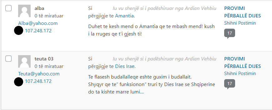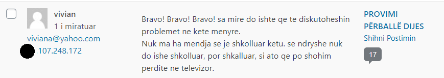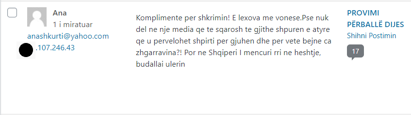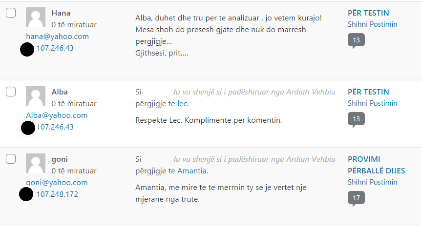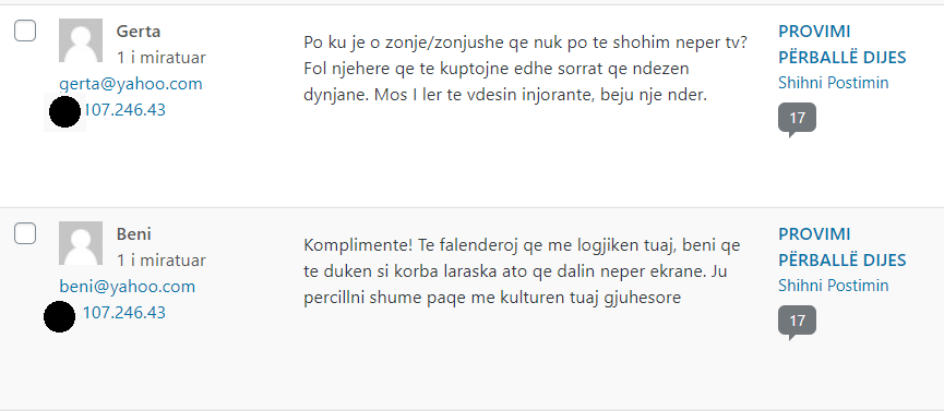 Nuk kam prova që komentet tek ne erdhën nga ndonjë troll farm dhe aq më pak që këtë mësymje e urdhëruan “nga lart”; por mund të provoj, megjithatë, se të gjitha komentet anonime, për të cilat flas, erdhën nga dy-tre burime vetëm (të identifikueshme nga IP-të; në shembujt më poshtë, këto IP i kam errësuar pjesërisht).
