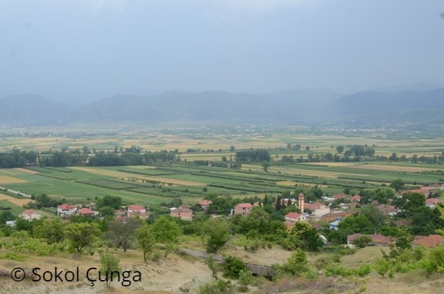 01: Pamje panoramike e Polenës siç duket nga kodrat në shpinë të fshatit. Përballë: fusha e Korçës dhe Mali i Moravës.