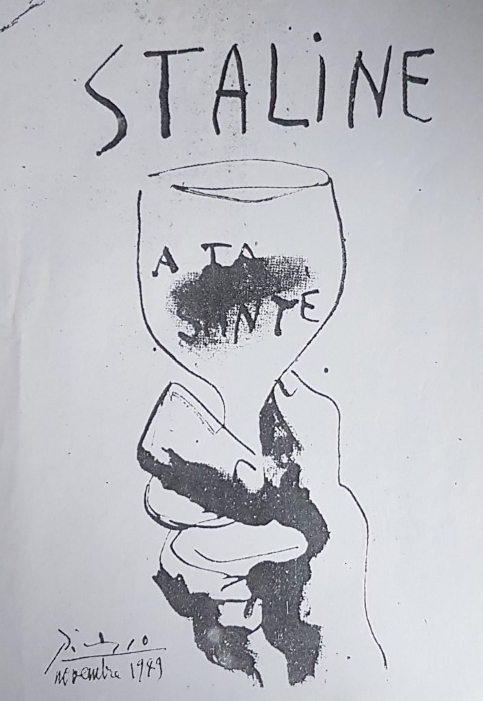 Në dhjetor të 1949, në Bolshoi Teatër, ishte festuar me madhështi 70-vjetori i “Babait të Popujve”. Faqja e gazetës që shihja në ekran ishte, sigurisht, jehonë e ngjarjes “fatlume”. Poeti i njohur, i konvertuar tashmë në komunist, zhvillonte në poezinë e tij të gjatë, një bisedë “të ngrohtë” me “shokun Stalin”, përmendte kalimthi “mirësinë” e tij dhe e mbyllte atë me vargjet prozaike: “Për të fituar ne kemi veprën dhe shembullin tënd”. Kurse shkrimtari dhe publicisti i famshëm rrekej të përhapte në opinionin francez “madhështinë” e figurës së Stalinit, “Njeriut të Komunizmit”, siç e quante ai. Po piktori gjenial ç’kishte bërë kështu? Unë nuk u besoja syve. Ai ngrinte dolli, duke i uruar, me germa të mëdha, shëndet Stalinit. Piktori dhe diktatori çukisnin nga larg gotën me njëri-tjetrin, kur ky i fundit pinte më shumë gjak se verë! Pas habisë, ndjeva thellësisht kënaqësinë e studiuesit që ndesh në dokumente të panjohura dhe me interes. Aparatura moderne e bibliotekës të jepte mundësinë e fotokopjimit të menjëhershëm dhe unë bëra disa fotokopje të këtij vizatimi të rrallë, si dhe të tjetrit, botuar në numrin e fillimt të marsit të vitit 1953.