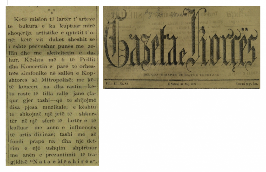 Faksimile e “Gazeta e Korçës” e datës 31 maj 1924 ku flitet për koncertin e orkestrës simfonike të drejtuar nga Thoma Nasi.