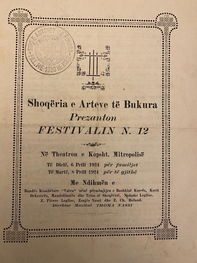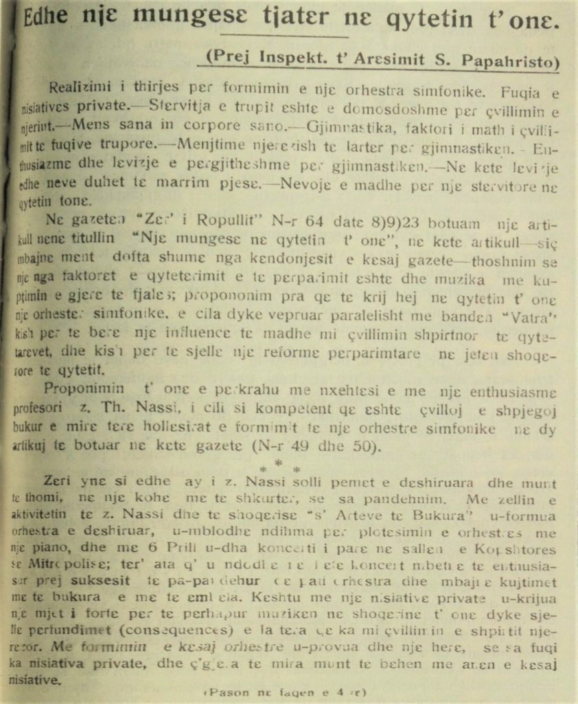 … vitin e shkuarë, me shumë mundime, u organizua një orkestër prej 16 vetash dhe në prezenciet e Shoqërisë së Arteve lojti disa pjesë të mira të Grieg-ut, Biset-it, Beethoven-it dhe të tjerëve, po nga njëra anë, duke mos patur përkrahje morale, dhe nga ana tjatër, dyke u larguar disa nga pjesëtarët e saj u përnda, kështu që e vetëmja organizatë muzikale që existon sot në Korçë, është Banda Kombëtare “Vatra” e përmbajtur nga ana e Bashkisë së Korçës. Qytetet e tjera të Shqipërisë nuk dëgjohetë të bëjnë gjë. Kjo është me pak fjalë gjëndja e Shqipërisë nga pikëpamja muzikale.