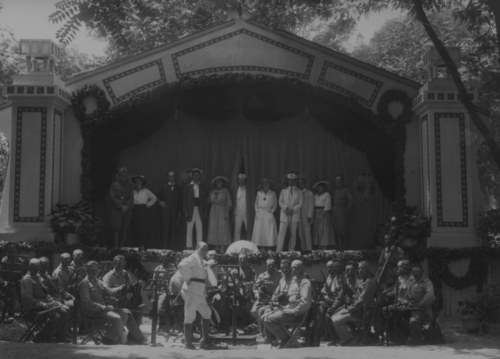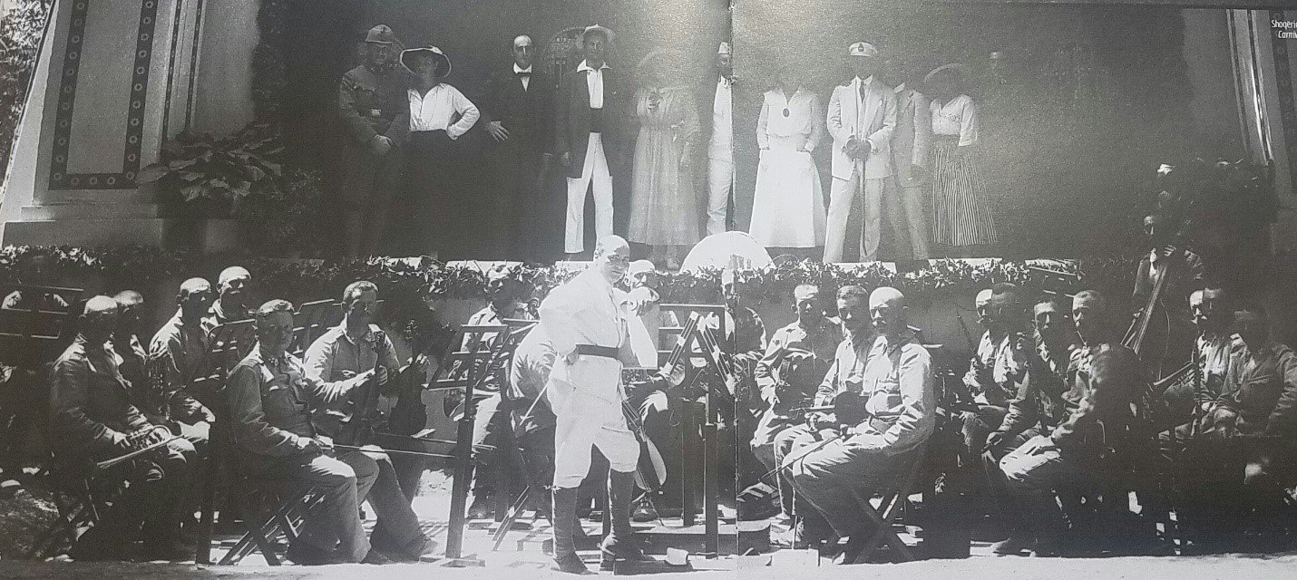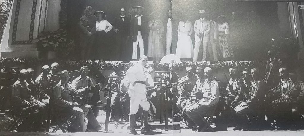Pjesë organike e trupave ushtarake të huaja të dislokuara në Shqipëri, e në këtë rast në Shkodër, ishin edhe formacionet muzikore, kryesisht të llojit të bandave muzikore frymore, siç i kemi dëshmuar edhe në kapitullin e parë të librit. Në një tjetër foto të panjohur të Marubit, foto e muajve maj-qershor 1913, bërë në lulishten qendrore të Shkodrës e njohur ndryshe edhe si “Milet bahçe”, kemi provën e vetme të ekzistencës së një orkestre simfonike austriake[6], e cila shoqëronte vënien në skenë të shfaqjeve teatrore për ushtarakët dhe për publikun e qytetit të Shkodrës. Në ato vite ishte normale në Europë e më gjerë që si filmat, ashtu edhe shfaqjet teatrore të shoqëroheshin me muzikë të luajtur nga ansamble muzikore ose nga pllakat e gramafonit.