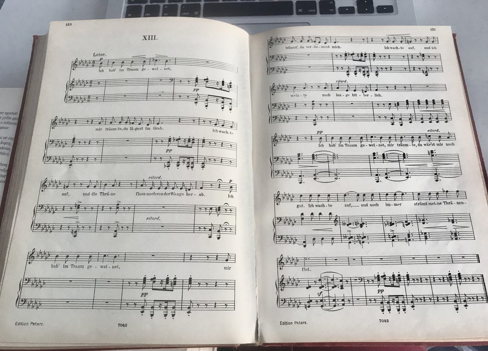 Me një recitativ të përmbajtur vokal që nis në Mi ♭ minor, zëri dhe pianoja deri në strofën e fundit nuk luajnë njëkohësisht. Linja vokale plotësisht nënvizon vetminë e poetit. Ëndrra ngrihet mbi një ton që përsëritet (si ♭) ku sekonda e vogël – edhe pas zgjimit, poeti i braktisur – vazhdon syhapur të shohë ndarjen nga muza e tij. Netëve, ëndrrat variojnë ashtu sikundër edhe kryqëzimet e tonaliteteve në mes e fundëstrofa! Schumann me qëllim kompozon një lloj skice minimale pianistike, gjë që i jep këngës një efekt tingulli të thellë. Po kështu në këngën “Allnächtlich im Traume seh’ ich dich” – Për natë në ëndërr ty të shoh” shoqërimi në piano është po aq i thjeshtë, paçka se në manuskript, vërehet se linja e pianos ende duhet arranzhuar, por pak para se të çojë partiturat për shtyp – Schumann-i enkas heq dorë me të drejtë nga ideja e një “ridizajnimi” të pianos.