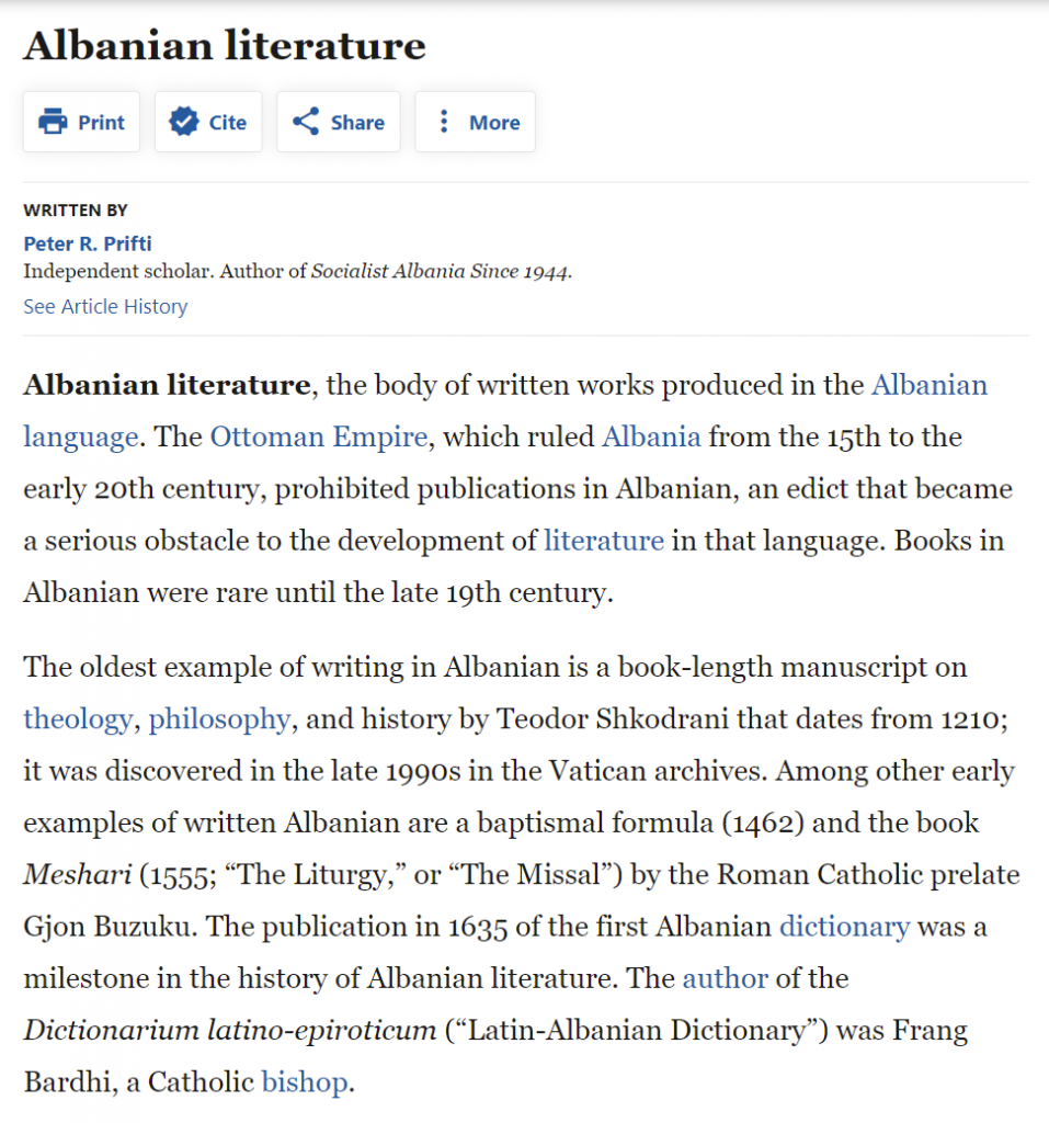 [5] “Skënderbeu në poezinë epike të arbëreshëve të Italisë”, artikull i vitit 1949, i botuar në vëllimin Nëpër shekujt letrarë, 8 nëntori, Tiranë 1973.