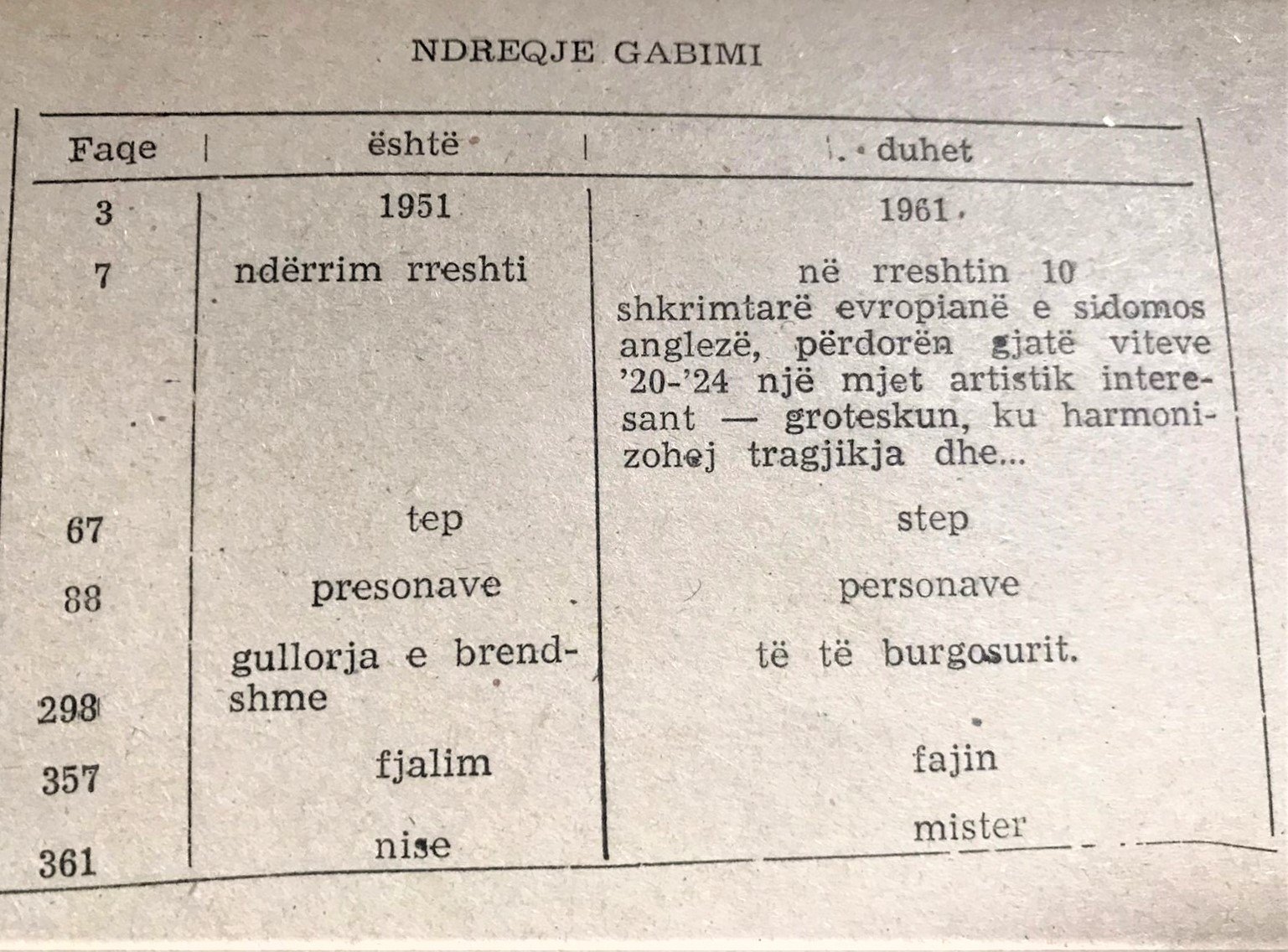 Mirëpo ajo letër e verdhë dhe e vogël me nënshkrimin « Ndreqje gabimesh » është jo vetëm një element i seriozitetit të botuesit, por edhe një metaforë më e gjerë e jetës. E vendosur në librat që botoheshin, ajo të kujton se gjuha është një formë që nuk mund të dëmtohet, ashtu si një pikturë që, nëse i bie një pikë bojë në anë, humbet aftësinë për të të dhënë kënaqësinë e duhur. Ajo fletushkë e verdhë na kujton se ne të gjithë identifikohemi me gjuhën që flasim. Personaliteti ynë apo karakteri ynë shfaqet, më së pari, në gjuhën që përdorim. Diktatura do të mbahet mend edhe për maninë gati paranojake për të ruajtur pastërtinë e gjuhës dhe për të garantuar shfaqjen në ligjërim të normës letrare me çdo kusht.