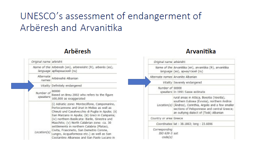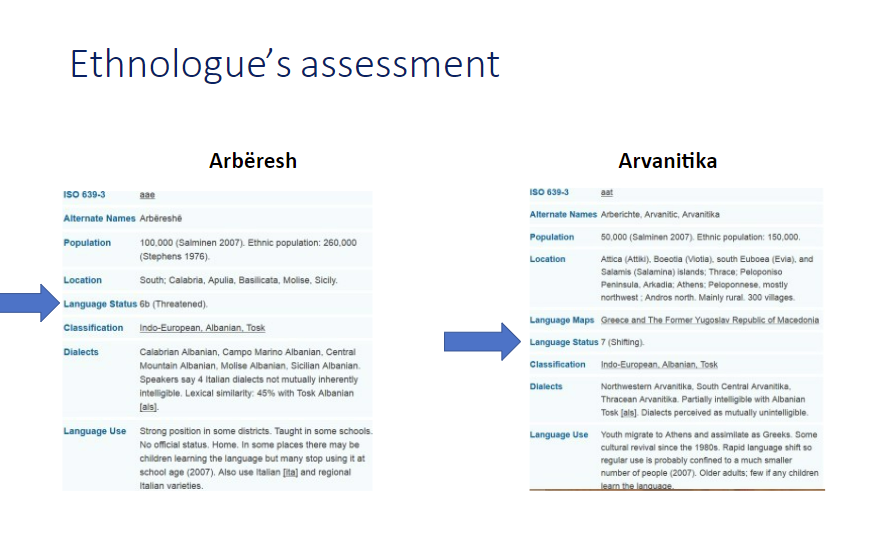 Sido qoftë, kjo e rrezikimit gjuhësor ishte tema e vetëm njërës kumtesë, simes, brenda dhjetëra kumtesave në konferencë (apo kuvend siç e quajtën), që s’patën asnjë lidhje me gjuhët në rrezik. Në atë kumtesë unë diskutova teorikisht si matet sot sa e rrezikuar është një gjuhë, çfarë shkallësh të tilla matëse ka dhe çfarë i bën ato të domosdoshme, dhe cilat janë problemet e saktësisë së matjes prej këtyre shkallëve. Në pjesën e  dytë të kumtesës analizova disa faktorë kryesorë dhe sa problematikë janë ata në matjen e rrezikut potencial dhe real që u kanosen arbërishtes dhe arvanitishtes. Kumtesa që është e dorëzuar në formën e një Power Point, do të shkruhet si artikull akademik dhe publikohet me aktet. Por po përmbledh këtu veç disa probleme matjesh të tilla. Duke qenë masive dhe të përbotshme, si dhe duke synuar të vjelin përgjigje për gjendjen e një numri të madh faktorësh, ato janë thjesht orientuese dhe kurrsesi mjaftueshëm të detajuara dhe ekzakte. Vetëm puna direkte dhe e zgjatur në terren e një grupi gjuhëtarësh, dhe përsëritja e pafund e ekspeditave të tilla, do sillte rezultate të kënaqshme. Kjo, pra, duhej bërë për mbi 7000 gjuhë që të dinim me siguri gjendjen e vitalitetit apo rrezikut për një gjuhë. Por hartuesit e shkallëve shpesh kanë pak fonde, pak njerëz, pak kohë, pak kushte. Po të vërehen emrat e specialistëve që merren për bazë për përcaktimin e vetëm njërit prej dhjetëra faktorëve (atë të numrit të folësve të gjuhës së rrezikuar)  në dy shkallë të ndryshme, atë të UNESCOs dhe atë Ethnologue, shihet qartë se ata janë të pamjaftueshëm, të kufizuar, të rastësishëm dhe të vjetruar. Pastaj një matje e tillë e numrit nuk është bërë kurrë bazuar në një census modern dhe askurrë prej një shteti dashamir ndaj minoriteteve të veta[v]. E fundit, gjendja e rrezikuar a jo, dhe vitaliteti gjuhësor ndryshojnë fort nga vendi në vend, nga një fshat arbëresh tek tjetri, madje edhe në lagje të ndryshme brenda një fshati[vi]. Në fund të kumtesës përqendrohem në disa karakteristika themelore të përdorimit dhe strukturës gjuhësore që injorohen apo anashkalohen prej të gjitha shkallëve duke qenë të vështira për t’u matur prej jo-specialistësh.