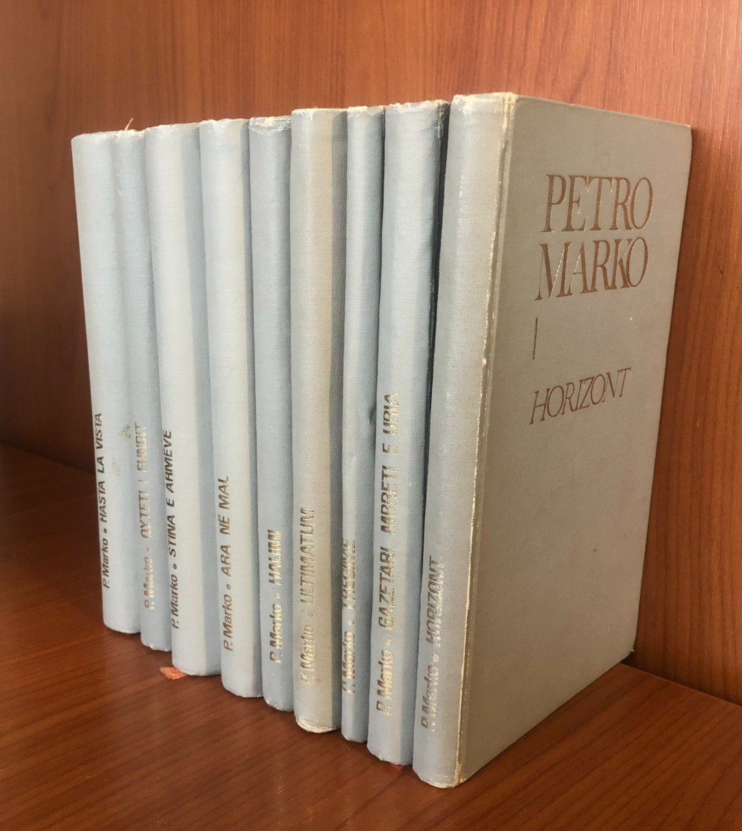 Në Prishtinë qe botuar, në vitin 1972, nga “Rilindja”, kompleti i Petro Markos në 9 libra, ku bëjnë pjesë: vëllimi me poezi “Horizont”, romanet: “Hasta la vista”, “Qytetit i fundit”, “Stina e armëve”, “Ara në mal”, “Halimi” dhe “Ultimatum”, libri me skica me titull “Gazetari, mbreti e uria” dhe libri me tregime me titull “Tregime”, por jo edhe romani “Një emër në katër rrugë”. Ky i fundit nuk është botuar jo vetëm në kuadër të kompletit prej nëntë librash, sepse ende nuk kishte “dalë” as në Tiranë (1973), por as më vonë (si libër i veçantë).