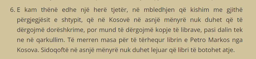“Me sa shoh tani, – thuhet në shkrimin tuaj – kopje të romanit e gjetën rrugën fshehurazi për në Prishtinë dhe vepra u botua dhe u lexua në Kosovë, pa “lejen” e autorit Marko dhe të autoriteteve në Tiranë. Nuk kam të dhëna të tjera për këtë incident, por mund të them se vetë fakti që një vepër letrare e asgjësuar në Shqipëri kapërceu kufirin dhe u botua gjetiu, madje në një shtet “armik” si Jugosllavia, mund të ish shfrytëzuar më tej nga agjentura jugosllave dhe jo vetëm, për të minuar pozitën ndërkombëtare të Shqipërisë, qoftë edhe në kundërveprim me çfarë kish ndodhur deri atëherë, me përkthimin e “Gjeneralit” të Kadaresë në Francë (1970)”.