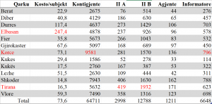 Raporti agjent për informator është më i lartë në Skrapar, Rrëshen, Peshkopi e Gramsh (1 me 10 a 8 përkatësisht). Tropoja e Tirana kanë raportin më të vogël. Raporti informator për subjekt është kryesisht i njëjtë nga 1 me 1 në Skrapar, në 1 me 4 në Tiranë.