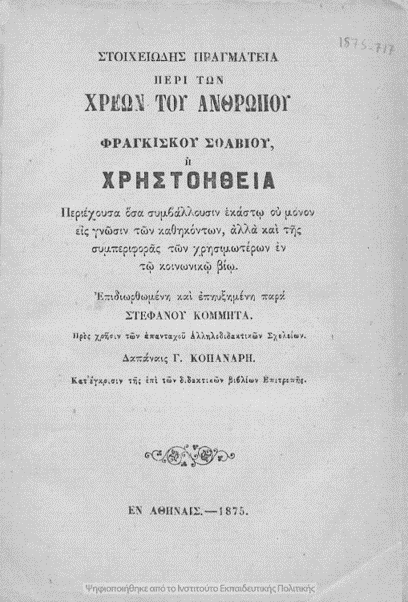 07. Στοιχειώδης πραγματεία περί των χρεών του ανθρώπου Φραγκίσκου Σοαβίου ή Χρηστοήθεια, Επιδιορθωμένη καὶ ἐπηυξημένη παρᾶ Στεφανου Κομμητα (Traktat elementar mbi detyrimet e njeriut, Krestomacia e Francesk Soavit, e korrigjuar dhe plotësuar nga Stefanos Komitas), Athinë, 1875.