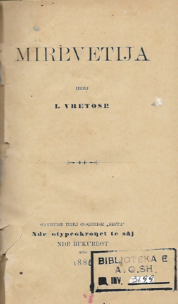 Mes veprës së Vretos, rasti tipik që po marrim si casus dhe na flet për realitetin e mësipërm është punim i tij Mirëvetija. Vepra është shtypur në Bukuresht më 1886 në Shtypshkronjën e Shoqërisë Shqiptare “Drita”, me gjasë pasi u korrigjua dhe u radhit nga vetë Vretoja. Libri ka 176 faqe të përmasave të vogla (pa llogaritur korrigjimet dhe faqet me një tabelë të alfabetit të shqipes). Është shtypur me alfabetin e Stambollit, përshtatur me mundësitë e karaktereve që kishte në dispozicion shtypshkronja, në përpjekje për të përmbushur nevojat fonetike të gjuhës shqipe. Në fund, në faqet e alfabetit të shqipes, jepen edhe shpjegimet fonologjike të rregullave të alfabetit në tri gjuhë, frëngjisht, rumanisht dhe greqisht, dhe shembuj për të ndihmuar drejtshqiptimin.
