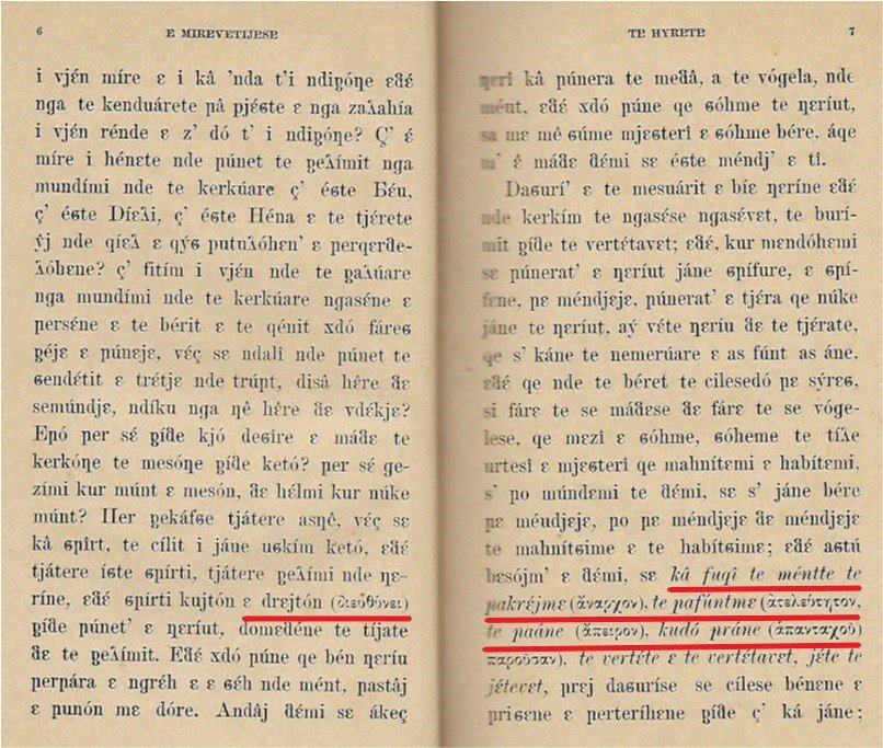 Fletë të Mirëvetijes vijëzuar tek fjalët shqipe të shpjeguara me greqishten në kllapa.