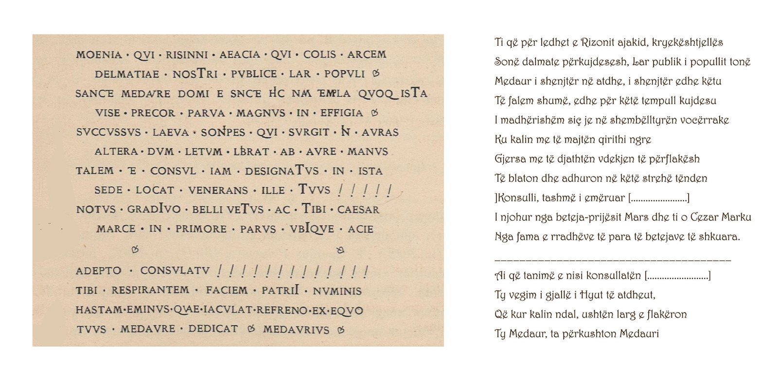 a. Antroponimia romake e zbërthen siglën M. vetëm me Marcus. Në pjesën e parë të mbishkrimit, kur konsulli ishte i emëruar por ende nuk e kishte nisur detyrën (consuli iam designatus), ai i përmbahet rregullit. Por në të dytën kur e kishte nisur detyrën (adepto consulatu) dhe si i parë i provincës nuk druhej më nga kush, ai e çkodon atë ndryshe. Vargu i fundit “ty Medaur, ta përkushton Medauri”, tregon se M.-ja fshihte emrin Medaur, si emrin e hyut.