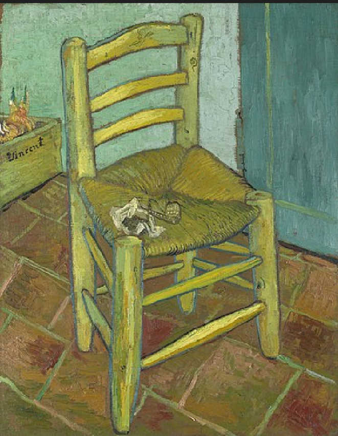 Piktura e karriges, aq e gjallë, sa duket sikur po ta prekësh do ndiesh nën gishtërinj drurin ose fijet e verdha të kashtës, është portreti i një miku që mungon, biseda të shkuara, biseda që nuk mund të bëhen, mall, vetmi.