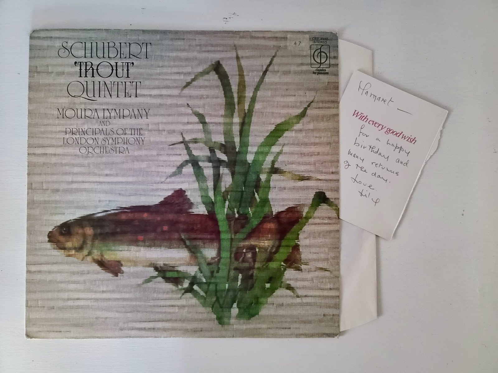 Sa i takon veprës që po dëgjoj, sipas Wikipedia-s, “Kuinteti i Troftës” (Forellenquintett) është ndër krijimet e para domethënëse të Shubertit, kompozuar kur ai ishte 22 vjeç, por që u publikua dhe fitoi famë vetëm pas vdekjes së autorit. Në mbështjelljen e pllakës shkruhet që vepra interpretohet nga pianistja Moura Lympany dhe instrumentistë kryesues nga Orkestra Simfonike e Londrës.