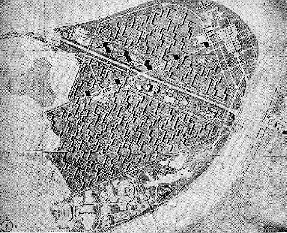 Fig. 7 Le Corbusier, Plani urbanistik për qytetin e Anversës, 1933. Të vihet re zgjidhja interesante e Le Corbusier-it ku prona publike behet gati hegjemonike në plan, dhe dominuese negativisht. Ndërkohë që në Tiranë Teatri Kombëtar i jepte qytetit vetëm një xhep të tillë, projekti i Anversës ishte një shumatore e këtyre ‘xhepave’ publikë. Nga ana tjetër, vetëm me hapësira publike me shumicë, për Le Corbusier-in, mund të ndërtoheshin kulla biznesi me shumicë.
