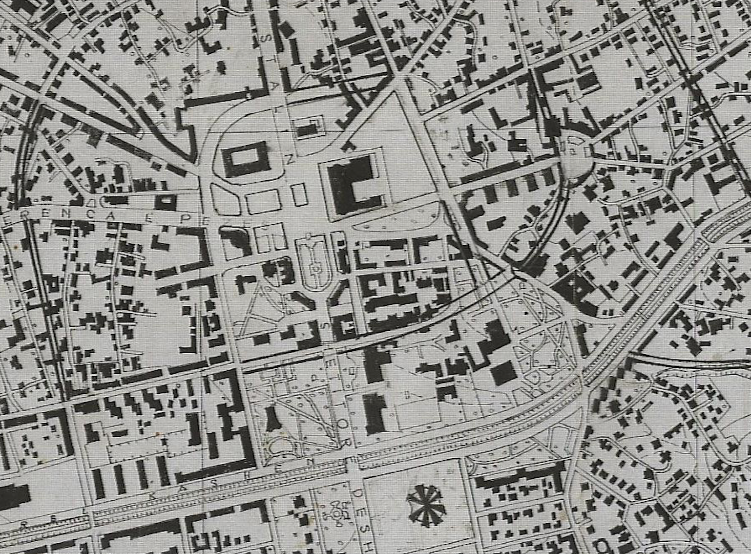 Fig. 4 Plani Rregullues i Tiranës i miratur në Shkurt të vitit 1990 nga Adil Çarçani. Duket qartazi hapësira e madhe e zënë nga Teatri si objekt publik në nja nga zonat më të privatizuara të Tiranës së sotme.