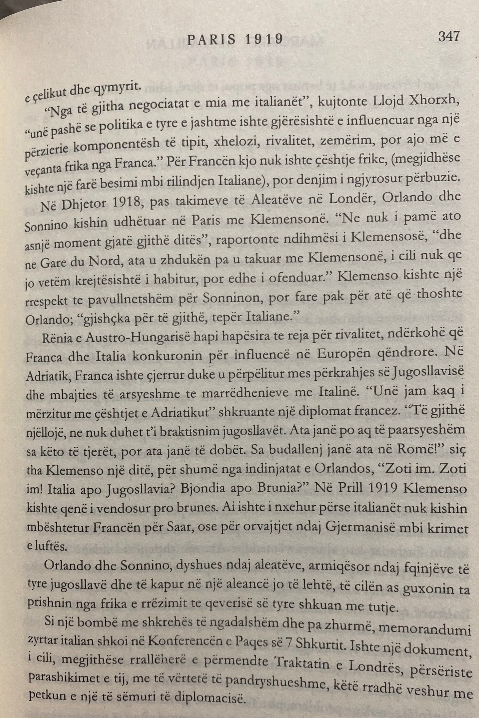 «Në Dhjetor 1918, pas takimeve të Aleatëve në Londër, Orlando dhe Sonnino kishin udhëtuar në Paris me Klemensonë. “Ne nuk i pamë ato asnjë moment gjatë gjithë ditës”, raportonte ndihmësi i Klemensosë,” dhe ne Gare du Nord, ata u zhdukën pa u takuar me Klemensonë, i cili nuk qe jo vetëm krejtësishtë i habitur, por edhe i ofenduar.” Klemenso kishte një rrespekt te pavullnetshëm për Sonninon, por fare pak për atë që thoshte Orlando; “gjishçka për të gjithë, tepër Italiane.»[13] (Sic!)