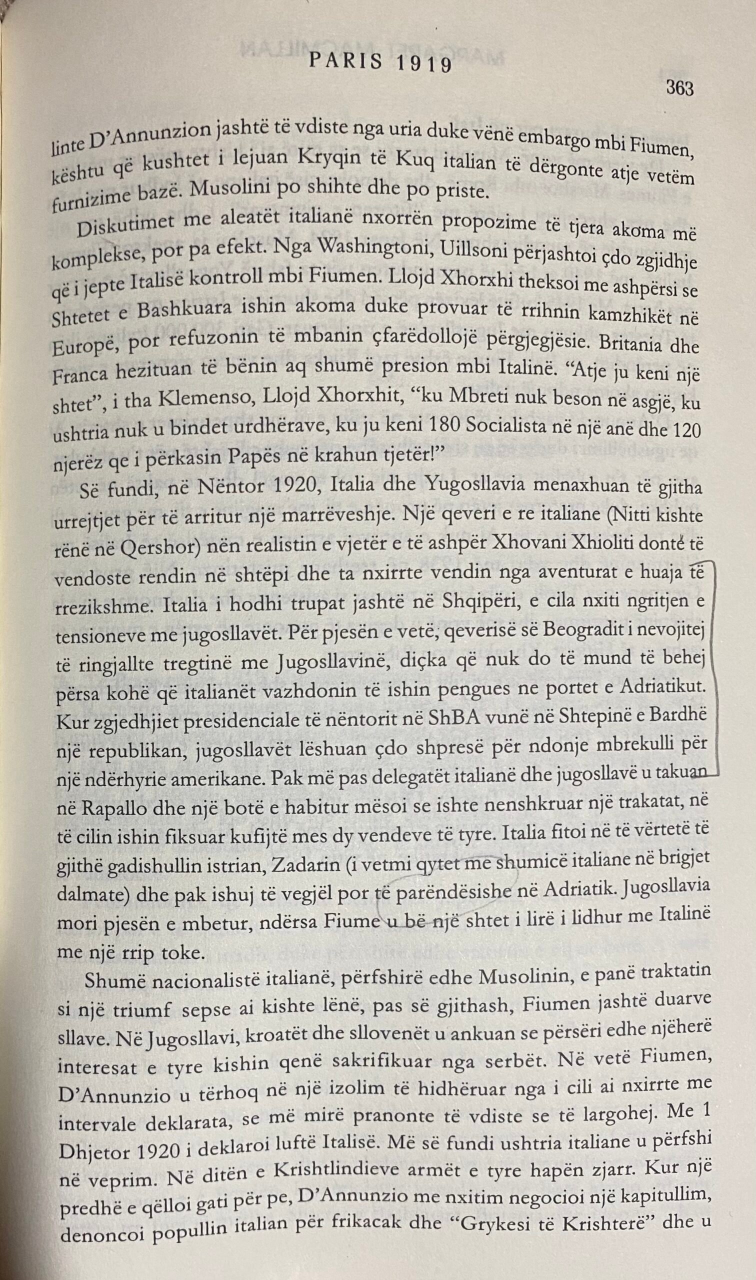 “Së fundi, në Nëntor 1920, Italia dhe Yugosllavia menaxhuan të gjitha urrejtjet për të arritur një marrëveshje. Një qeveri e re italiane (Nitti kishte rënë në Qershor) nën realistin e vjetër e të ashpër Xhovani Xhioliti donte të vendoste rendin në shtëpi dhe ta nxirrte vendin nga aventurat e huaja të rrezikshme. Italia i hodhi trupat jashtë në Shqipëri, e cila nxiti ngritjen e tensioneve me jugosllavët. Për pjesën e vetë, qeverisë së Beogradit i nevojitej të ringjallte tregtinë me Jugosllavinë, diçka që nuk do të mund të behej përsa kohë që italianët vazhdonin të ishin pengues ne portet e Adriatikut. Kur zgjedhjiet presidenciale të nëntorit në ShBA vunë në Shtepinë e Bardhë një republikan, jugosllavët lëshuan çdo shpresë për ndonje mbrekulli për një ndërhyrie amerikane. Pak më pas delegatët italianë dhe jugosllavë u takuan në Rapallo dhe një botë e habitur mësoi se ishte nenshkruar një trakatat, në të cilin ishin fiksuar kufijtë mes dy vendeve të tyre. Italia fitoi në të vërtetë të gjithë gadishullin istrian, Zadarin (i vetmi qytet me shumicë italiane në brigjet dalmate) dhe pak ishuj të vegjël por të parëndësishe në Adriatik. Jugosllavia mori pjesën e mbetur, ndërsa Fiume u bë një shtet i lirë i lidhur me Italinë me një rrip toke.[14]” (Sic!)