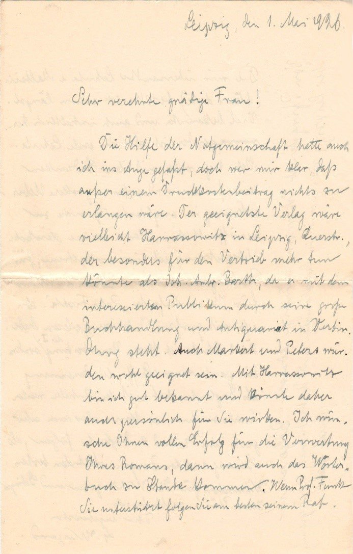 Edhe kjo letër mbyllet si dy të mëparshmet me një ton të ngrohtë e miqësor. Për vitin 1926 në arkivin e baroneshës gjendet dhe një letër e Harrassowitz-it e datës 26.06.1926, pra e ndërkallur në kohë ndërmjet letrës së parafundit dhe asaj të fundit të Weigand-it. Botuesi i fjalorit, Hans Harrassowitz-i (1885-1964), e ka marrë në dorë drejtimin e shtëpisë botuese në vitin 1921, pas vdekjes së të atit Otto Harrassowitz-it (1885-1920), themeluesit të shtëpisë botuese në fjalë. Pas kalkulimeve financiare, Hans Harrassowitz-i shpreh mendimin e tij për një shkurtim radikal të materialit të mbledhur, thekson se për këtë gjë ka biseduar edhe me Weigand-in dhe i propozon baroneshës me transparencë, që t’i dërgojë dy kalkulime financiare: për variantin e shkurtuar dhe atë të pashkurtuar të fjalorit. Ai e mbyll letrën duke e çmuar veprën për vlerat e jashtëzakonshme të saj. Në dhjetor të vitit 1926 vijon kontrata e rregullt me shtëpinë botuese së bashku me një shtojcë plotësuese në vitin 1927. Të dyja materialet janë të ruajtura mrekullisht dhe mund të lexohen shumë qartë.