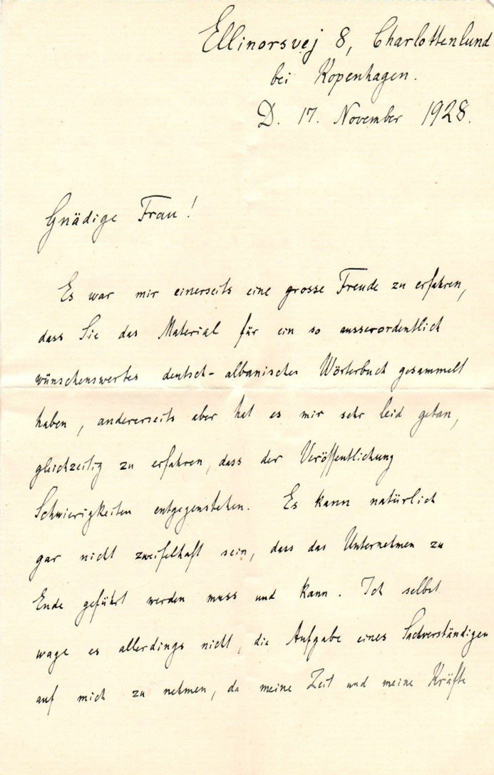 “Çfarë mendoni për një ribotim të fjalorit tuaj gjermanisht-shqip? Ribotimi do të ishte një detyrë urgjente dhe me vlerë, duke qenë se për fat të keq në magazinën e Harrassowitz-it u dogjën të gjitha kopjet e veprave tuaja që ndodheshin aty. E nderuar zonja baroneshë, nuk do të kishit dëshirë t’i përvisheshit punës sërish? Kësisoj do t’i bënit një shërbim shumë të vyer albanologjisë.”