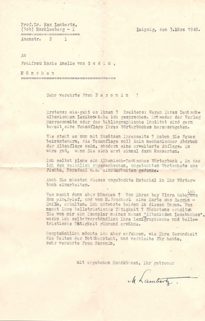 Në vitin 1943 Lambertz-i ishte shpërngulur në Lajpcig dhe qysh prej vitit 1946 punonte si profesor në universitetin e këtij qyteti. Para se ta mbyllë letrën dijetari e siguron baroneshën, se do ta njoftojë sërish për projektin e tyre të përbashkët, pra për fjalorin:
