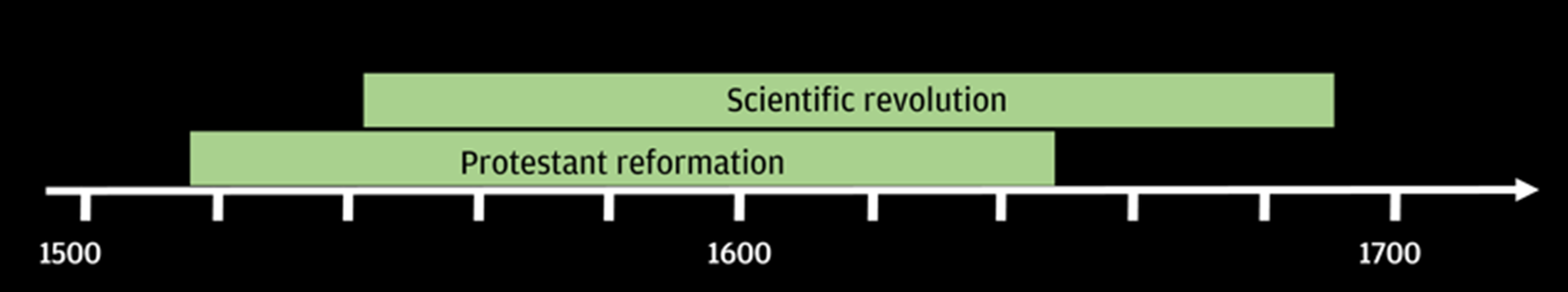 Atëherë, kur filluan filozofët e natyrës të shkëputeshin nga mendimi grek i studimit të fenomeneve natyrore dhe të zhvillonin kështu një qasje më empirike? Kjo ndodhi vetëm kur ndryshoi mendimi se cili është burimi i rregullsisë në natyrë. Sipas historianëve të shkencës, kjo zhvendosje e mendimit ndodhi për shkak të ritheksimit të disa doktrinave biblike gjatë mesjetës së vonë dhe veçanërisht gjatë dhe pas Reformës Protestante.[16] Në fakt, siç shihet në figurën e mëposhtme, periudha e revolucionit shkencor përkon me periudhën e reformimit protestant.