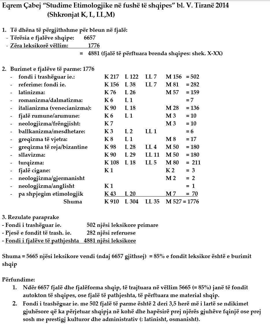 Të dhënat e rrokura më lart vetëm për një vëllim të veprës madhore të Eqrem Çabejt janë pa dyshim domethënëse për gjithë produktin e punës së tij si gjuhëtari historian më i spikatur në studimet etimologjike në fushë të shqipes. Ato janë gjithashtu edhe një sinor orientues lidhur me përafërinë në rezultate të studimeve etimologjike ndër etimologët e tjerë shqiptarë dhe të huaj që janë marrë dhe merren intensivisht me studimin e leksikut historik dhe bashkëkohor të gjuhës shqipe në kohën tonë. Ato janë po aq domethënëse lidhur me gënjeshtrën, manipulimin e të dhënave dhe mashtrimin që trumbetojnë turbologët në kohën tonë gjatë linçimit të shkencave albanologjike shqptare.