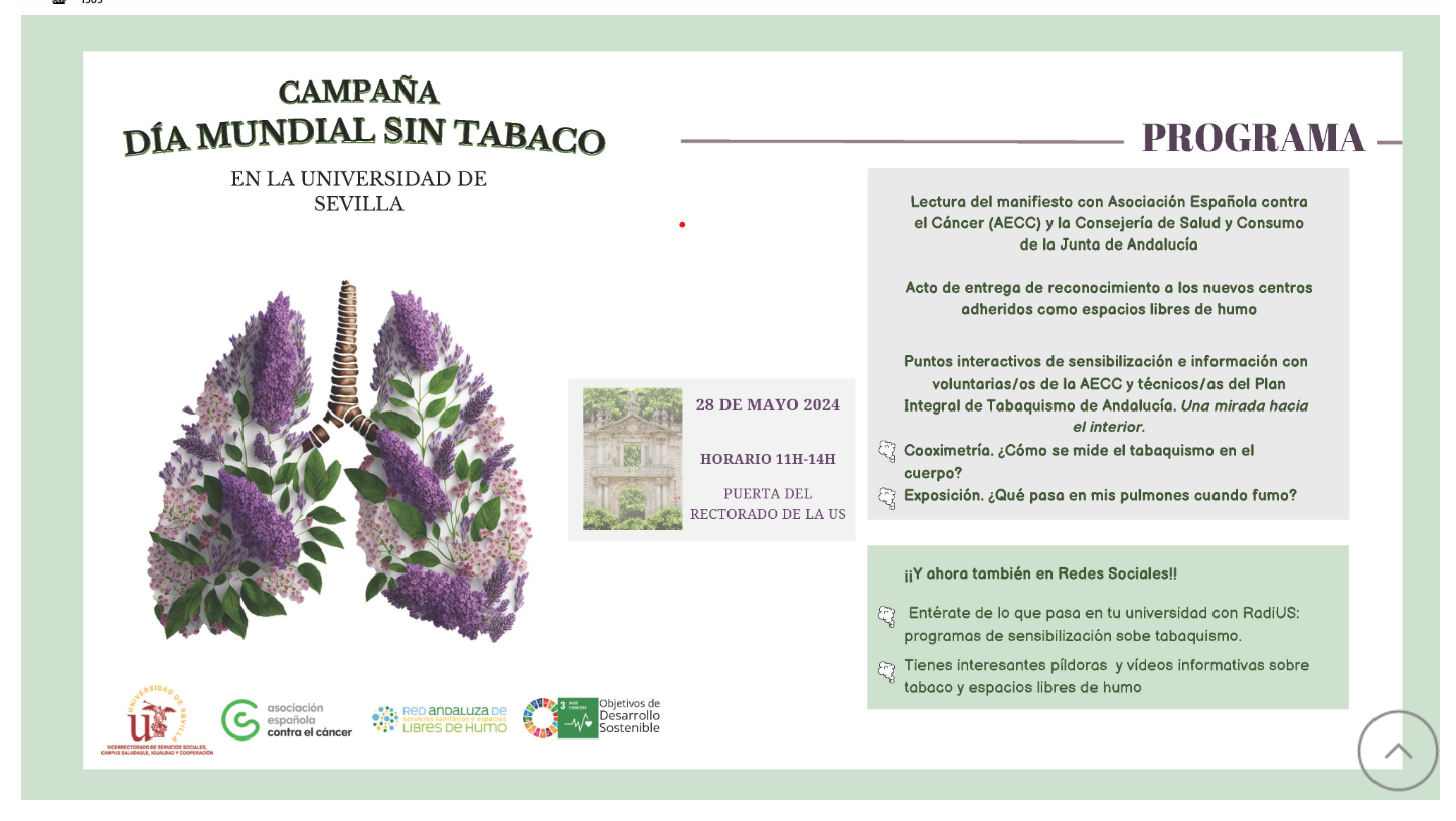 Kur ishim tani së fundi në Spanjë, u habitëm kur pamë, në oborrin te hyrja e Rektoratit të Universitetit të Seviljes, një poster të madh kushtuar Ditës botërore pa duhan (Día mundial sin tabaco/World No Tobacco Day 2024).