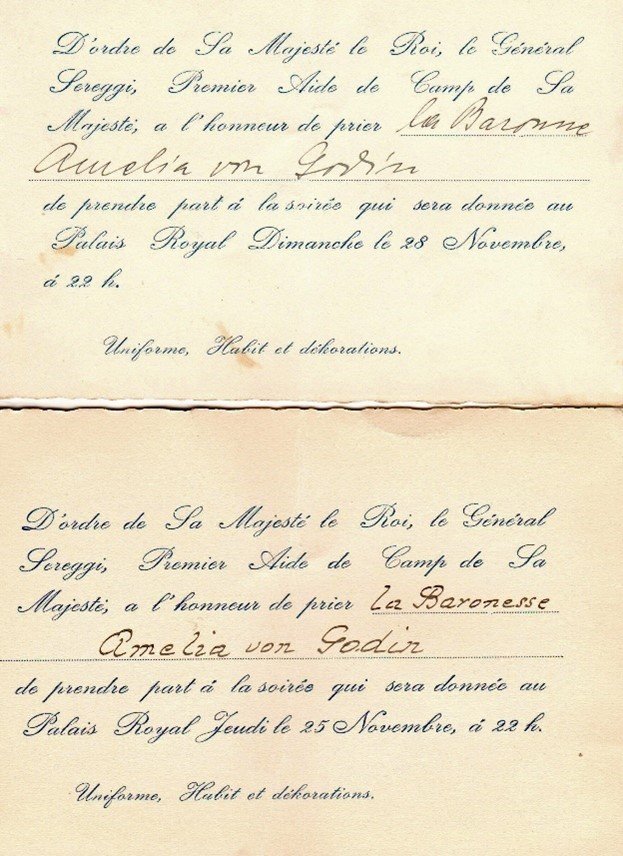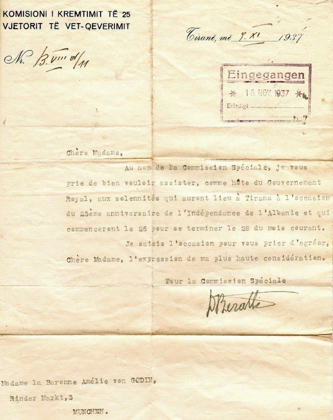 Ndër këta të ftuar nderi ishte dhe Godini. Në kronikën e saj familjare ajo përshkruan disa nga aktivitetet e mësipërme dhe veçanërisht Tiranën festive të atyre ditëve. Në arkivin privat të baroneshës kemi pasur fatin të gjejmë ftesën personale që i është bërë asaj si e ftuar nderi në kremtimet e 25-vjetorit të pavarësisë, dy ftesat për ballot e organizuara në datat 25 dhe 28 nëntor, si dhe fjalimin origjinal të mbajtur me këtë rast nga ajo vetë në gjuhën shqipe. Lidhur me datat, duhet të tërheqim vëmendjen për disa mospërputhje. Ftesa zyrtare përfshin periudhën nga data 26 deri më 28 nëntor, dy ftesat e ballove janë për datat 25 dhe 28 nëntor, kurse në kronikën e baroneshës përmenden datat 21, 22, dhe 23 nëntor.