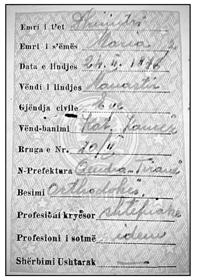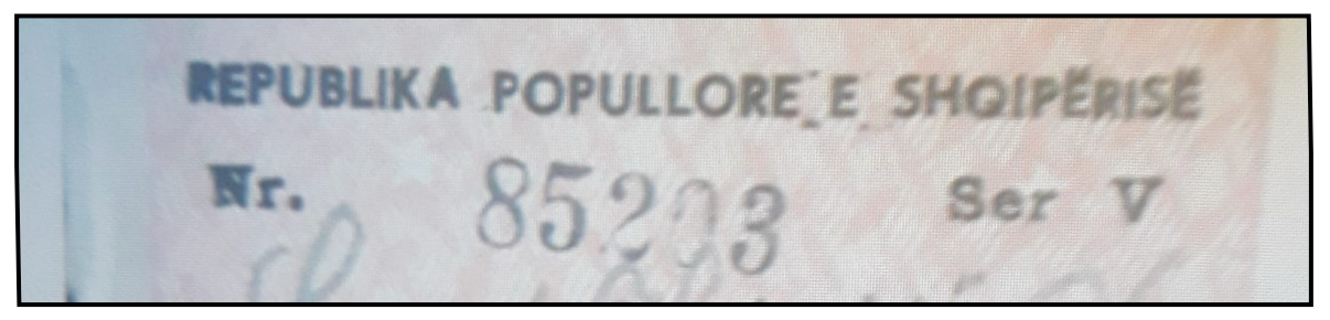 - Të dhëna fizike. Në faqen e parë është shtypur “Ser V” dhe është stampuar numri 85203. Besojmë se bëhet fjalë për serinë e pestë të letërnjoftimeve, kurse numri i dokumentit duhet të jetë unik për Sevastinë. Do të ishte interesante të gjejmë regjistrin zyrtar që korrespondon me këtë seri, si dhe të studiohet praktika e lëshimit të letërnjoftimeve.
