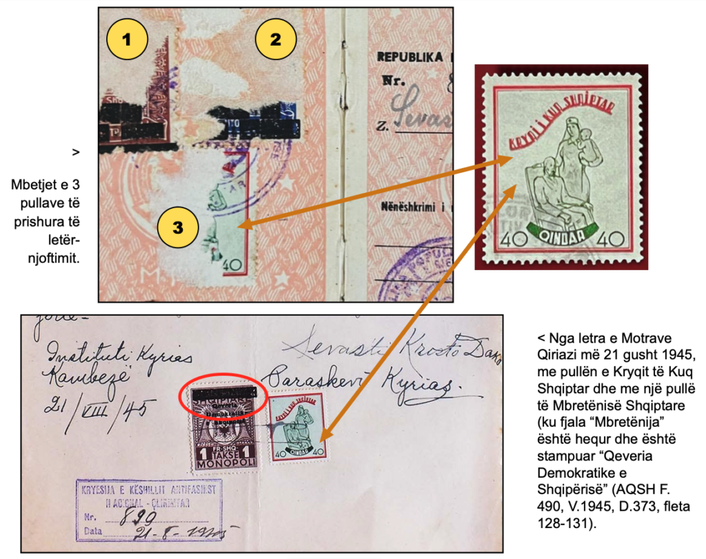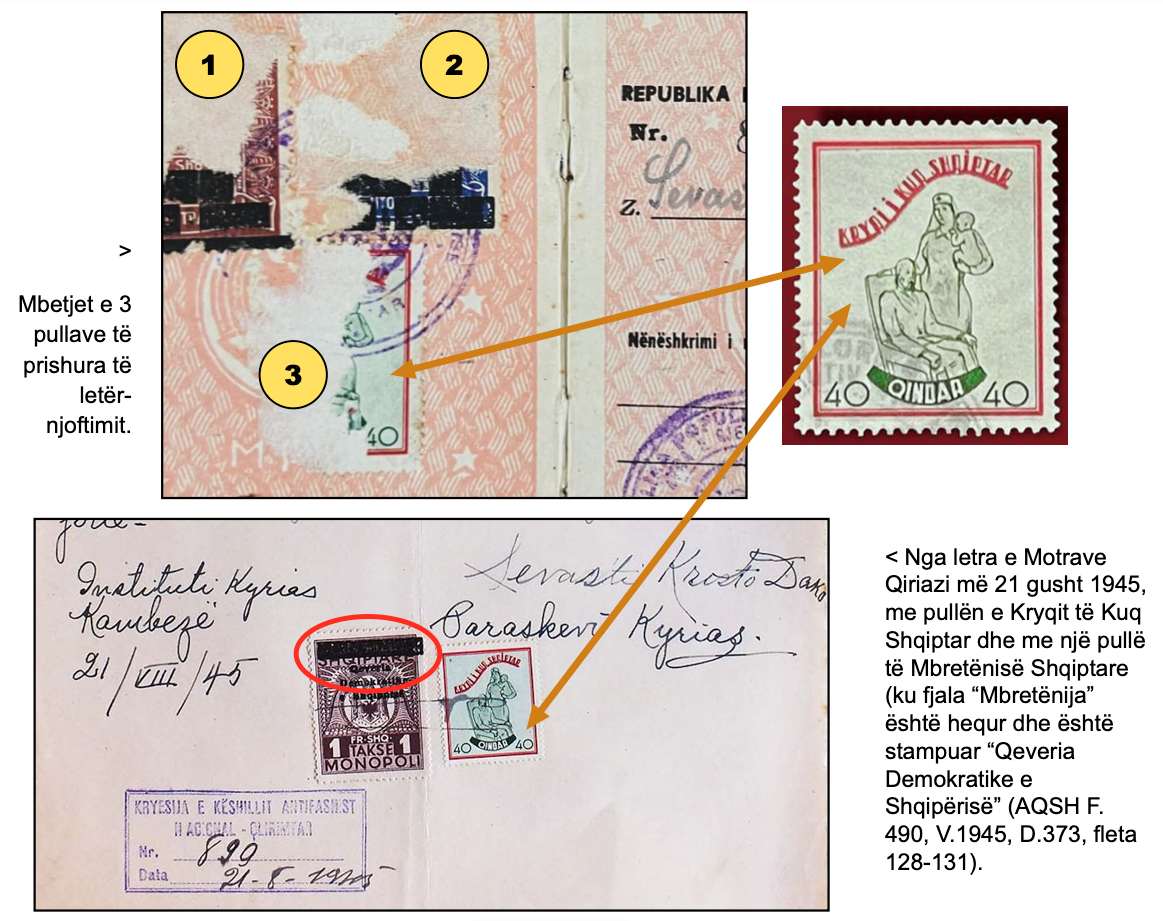 - Tri pulla të shkatërruara: Në një faqe të letërnjoftimit, dallohen mbetjet e tri pullave të afishuara, të cilët janë gërvishtur dhe hequr, me disa fjalë të rëna përsipër me bojë të zezë (shih imazhin në faqen tjetër). Edhe këto kanë rëndësi për letër-njoftimin, sepse lindin pyetjet se çfarë ishin këto pulla, të cilit vit ishin, dhe në ç’kushte vendosi dikush t’i hiqnin ato nga letërnjoftimi. Identitetin e njërës pullë e gjetëm nga studimi i një dokumenti tjetër në AQSH (F. 490, V.1945, D.373, fleta 128-131), pra një letër e trishtueshme nga motrat Qiriazi më 21 gusht 1945, për Kryesinë e Këshillit Antifashist Nacional–Çlirimtar, duke iu lutur që të mos dëboheshin nga banesa e tyre në Kamëz. Tek kjo letër zbulojmë pullën e njëjtë, por të plotë: një pullë “40 qindar”-she që nderon Kryqin e Kuq Shqiptar. Kjo organizatë u themelua në vitin 1921[3] dhe kishte lidhje të drejtpërdrejta me amerikanët si Charles T. Erickson[4], klerik dhe misionar protestant në Shqipëri. Eriksoni kishte lidhur në martesë Sevastinë me Kristo Dakon në Manastir në verën e vitit 1910[5] (vërejmë këtu që sikur t’i përkisnin vërtet Kishës Ortodokse më 1910, vendimi për t’u martuar nga një klerik protestant do të shkaktonte telashe me Kishën, mundësisht deri në shkishërim). Dy pullat e tjera të letërnjoftimit, besojmë, janë pullat e ish-Mbretnisë Shqiptare, që kishin ngelur në përdorim në fillimet e shtetit të ri shqiptar. Shteti (si duket) i kishte modifikuar këto, duke u rënë me vizë të zezë fjalëve dhe simboleve të Mbretërisë. Dihet se më 1937 Kristo Dako, bashkëshorti i Sevastisë, kishte shkruar librin Shënime historike nga jeta dhe vepra e Nalt Madhërisë së Tij Zogu i Parë Mbreti Shqiptarvet (u botua edhe në anglisht), fakt që solli rreziqe për motrat Qiriazi kur ra mbretëria. Meqë shteti komunist, me kalimin e viteve, shfrytëzonte gjithçka mundej për të ngritur akuza padrejtësisht, nuk duhet të habitemi nëse, më vonë, Parashqevia apo Skënder Dako (i biri i Sevastisë) t’i ketë shkatërruar pullat për të eliminuar ndonjë pretendim të lidhjeve të tyre me amerikanët apo zogistët. Sigurisht, ka mundësi që edhe një fëmijë, matrapaz apo koleksionist t’i ketë hequr pullat, kështu kjo mbetet enigmë.