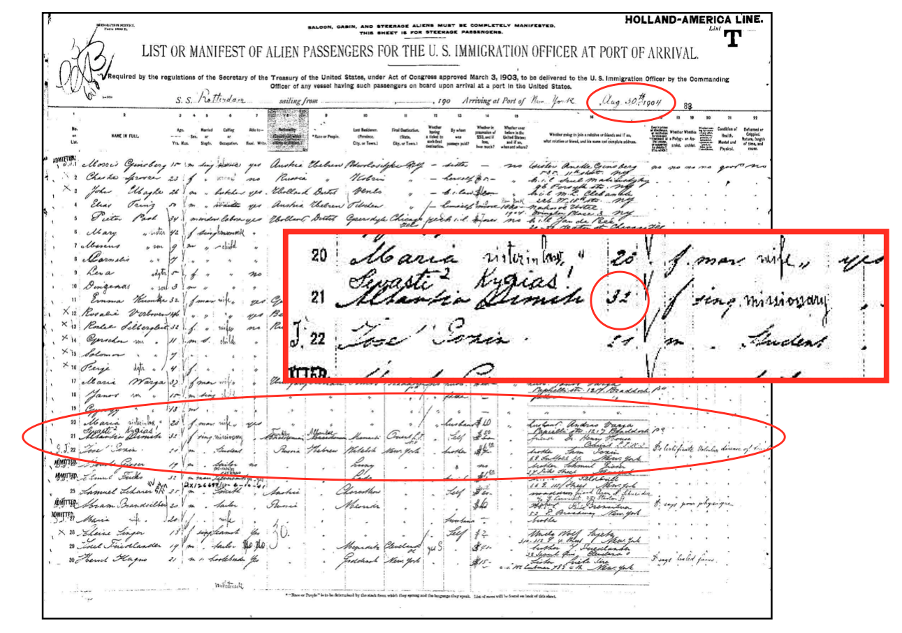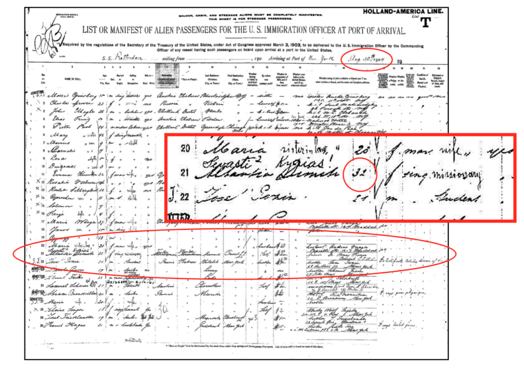 - Data e lindjes. Këtu kemi një gabim. Ditëlindja jepet si 24 shkurt 1876, kurse te varri i Sevastisë jepet viti 1870, vit që u pranua edhe nga studiuesi i ndjerë Dhimitër Dishnica, i cili bashkëpunoi nga afër me Aleksandër Dakon, djalin e Sevastisë.[6] Viti i gabuar 1876 del disa herë në dokumentet e shtetit shqiptar për lindjen e Sevastisë.[7] Ku qëndron problemi? Diploma e Sevastisë nga shkolla e mesme protestante amerikane në Manastir daton në vitin 1888, kurse në vitin 1891 ajo diplomohet nga Kolegji Amerikan për Vajza në Kostandinopojë, i cili ishte edhe ai kolegj protestant.[8] Domethënë, sikur t’i zihet besë këtij letërnjoftimi, del që Sevastia ka shkuar në Stamboll për universitet kur paska qenë vetëm 12 vjeç dhe mori leje zyrtare nga Sulltan Abdylhamiti për të hapur Shkollën e Vashave kur ajo paska qenë 15 vjeç. Del se ajo ishte vetëm 15 vjeç kur mbërriti në Korçë për të hapur shkollën me Gjerasimin! Por ka një detaj tjetër: dikush më vonë ka bërë një korrigjim me dorë, duke hequr me vizë shifrën “6” e duke shkruar në cep shifrën “2” (pra, duke e korrigjuar vitin e lindjes nga 1876 në 1872), por prapëseprapë ka mospërputhje, meqë disa shkrime, dhe varri, japin 1870-ën për vitin e lindjes. Para disa vitesh, ne kemi botuar një dokument amerikan, te zbuluar prej nesh, qe i takon vitit 1904, kur Sevastia udhëtoi në ShBA me anije (shih më poshtë). Kur ajo e plotësoi dokumentin e mbërritjes për zyrtarin e imigracionit, e përshkroi veten si “misionare” dhe “mikeshë e dr. Henry House” (misionar protestant i Bordit Amerikan në Selanik, me të cilin kishte bashkëpunime rajonale). Për “moshë”, e ka shkruar “32”, që përcakton vitin 1872 si vitin e lindjes. Viti i saktë i lindjes mbetet për t’u konfirmuar, 1870 apo 1872, por me siguri nuk ishte 1876.