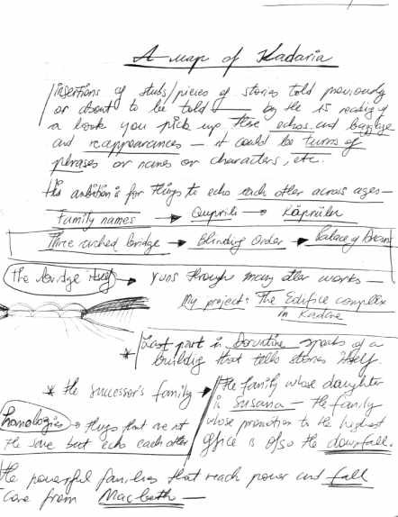 Unë mbaj 60 faqe shënime e shkarravina (i kam me vete edhe sot), ku mundohem të krijoj një shëmbëlltyrë të asaj bote: kryeqytetet e mëdha, pallatet, kullat, urat, lagjet, emrat që udhëtojnë nga njëra gjuhë në tjetrën, motivet që përsëriten në kohë e hapësirë, intrigat që marrin formë fizike. Disa prej këtyre detyrohem t’i skicoj e vizatoj.