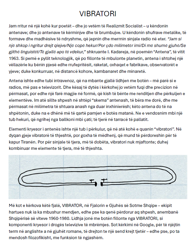 Vitet 1970 ishin, për ne në Tiranë, edhe vite të antenave: pas plenumit IV regjimi e fiku ripetitorin e RAI-t në Dajt, dhe sinjali i drejtpërdrejtë nga Italia nuk ish më aq i fortë, sa në fillim të viteve 1960. Banorët filluan të shpërndajnë, dorazi, skema antenash gjithnjë e më të sofistikuara, të vizatuara me dorë, por nga një dorë e sigurt inxhinieri, me gjithë përmasat e elementeve; u ngjanin disa imazheve të skeleteve të peshqve, në librat e vjetër të zoologjisë, kjo edhe për shkak të kujdesit për detaje, nga ana e vizatuesve. Njëherazi, u shtuan edhe vullnetarët që shëtisnin në lagje, për të pikasur antena të papërshtatshme dhe për të sinjalizuar autoritetet, ose edhe për t’u kërkuar të zotëve që t’i ulnin poshtë – tek e fundit, RTSH-në mund ta kapje vetëm me një “vibrator” (kështu quhej elementi kryesor i antenës, ku lidheshin edhe kontaktet e kabllos).