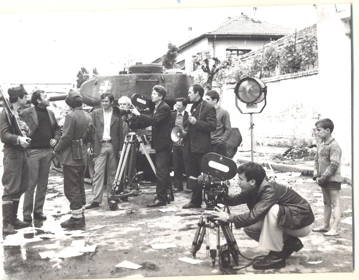 Foto nga sheshi i xhirimit, gjatë përgatitjes së një skene që pastaj do të filmohej natën, me tankun gjerman në sfond. Fëmija djathtas me gjasë është banor i lagjes, por njëherazi pjesë e grupit të produksionit (mbase e dërgonin për të blerë ndonjë paketë cigare) dhe pjesë e realitetit që rrëfen filmi: fare mirë mund ta përfytyroj si të ardhur nga viti 1944. Falënderoj Arkivin Qendror Shtetëror të Filmit, që bujarisht më lejoi ta përdor këtë foto.