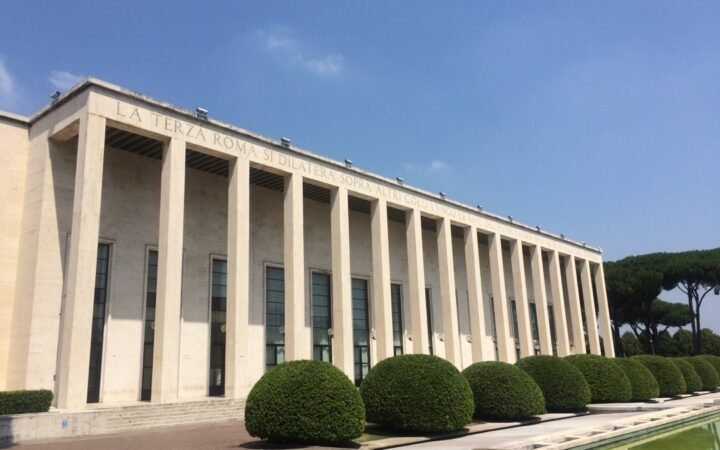 Si shumë banorë të tjerë të Tiranës, isha fort i lidhur me sheshin Skënderbej, kompleksin e ministrive, bulevardin e madh, kompleksin që përfshinte Rektoratin, Institutin e Lartë të Arteve, Bibliotekën e Universitetit dhe Muzeun Arkeologjik dhe Stadiumin Kombëtar (atëbotë “Qemal Stafa”); shumë mbrëmje i kam kaluar edhe unë, duke shëtitur mes kësaj copëze të Italisë në Shqipëri; dhe duke e ndier bukurinë e posaçme sa të ndërtesave vetë, aq edhe të kombinimit të tyre, të sintaksës, të pentagramit. Veç tyre nuk kish gjë tjetër, në Tiranë, për të admiruar si arkitekturë. Nuk them dot që e prisja ta gjeja këtë lloj qyteti edhe në Romë; në atë kohë Roma më sillte ndër mend vetëm pak imazhe të Sheshit San Pietro, të Koloseut, të Foro Romano dhe të Castel Sant’Angelo, që i kisha parë në filma; ndoshta edhe të ndërtesave qeveritare italiane, si Palazzo Chigi dhe Quirinale, që i tregonin në lajmet; por jo shumë më tepër. Por për shkak të padijes ime, edhe nuk u kapa shumë në befasi; sepse nuk kisha me çfarë të krahasoja. Më kujtohet që ditët dhe javët e para vajtëm të shohim Koloseun dhe u ndalëm edhe tek “atraksionet” e Romës Baroke – Fontana di Trevi, Piazza Navona, Piazza del Popolo, Piazza di Spagna, Panteoni; por nuk ishim gati për t’i lexuar e kuptuar këto bukuri, të cilat thjesht i përvetësonim mekanikisht, për të thënë pastaj që “i kishim parë”; më shumë sikur na tërhiqte Piazza Venezia, me Altare della Patria, që na e ngacmonte imagjinatën më fort; shkuam edhe në Piazza San Pietro, ku u hutuam me kolonadën rrethore dhe pastaj u humbëm në katedrale – por as aty nuk i kishim kodet, për të deshifruar. Kisha parë, në një katalog, një fotografi të Palazzo della Civiltà Italiana, në EUR, një lagje mjaft larg sonës; por që më pat pëlqyer, sepse m’u duk sikur i ngjante godinës sonë të Rektoratit të UT, në Tiranë. U sugjerova miqve të mi të shkonim një ditë atje për ta vizituar; dhe ashtu bëmë. Lagjja EUR ka diçka artificiale, diçka që banorët e Romës vetë nuk e kapërdijnë dot, sepse u duket “e huaj” për qytetin; një lagje e ndërtuar nga regjimi fashist, për Ekspozitën Universale të Romës, me ndërtesa dhe hapësira të mëdha dhe plot dritë. Vetë Pallati i Qytetërimit Italian, bartës i mbishkrimit “Un popolo di poeti di artisti di eroi di santi di pensatori di scienziati di navigatori di trasmigratori”, të nxjerrë nga një fjalim i Mussolini-t në vitin 1935, njihet edhe me emrin “Koloseu katror”, gati 70 metra i lartë dhe mbahet si ikona arkitektonike e shekullit XX të Romës (“Novecento romano”).