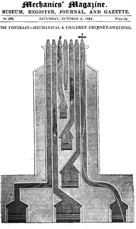 Prerje tërthore e një oxhaku me shtatë gryka të një shtëpie katërkatëshe me bodrum. Vizatimi, me autor Joseph Glass, është botuar në revistën “Mechanics’ Magazine” më 1834 dhe ilustron dallimin midis një pastrimi mekanik (djathtas) dhe atij të kryer nga fëmijët. Mbi germat B, C dhe E janë vizatuar silueta fëmijësh në pozicione të ndryshme (me shpjegime teknike të rastit).