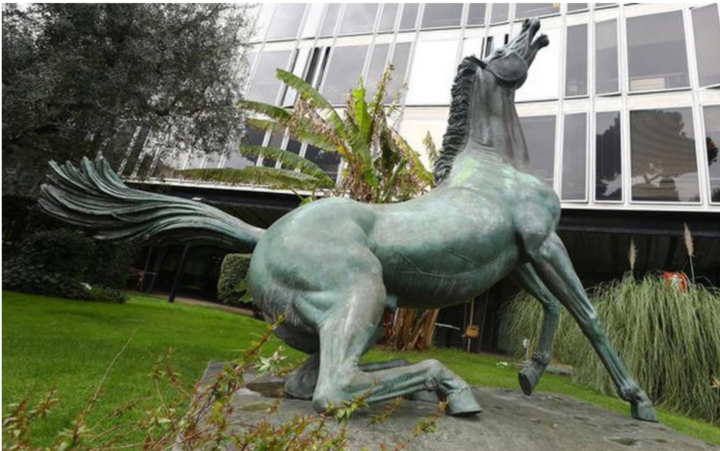 E pashë edhe kalin – përmes kangjellave. Një kalë pa kalorës, që në krye të jepte përshtypjen e një monumenti të gjymtuar ose të mbetur përgjysmë. Kjo statujë, që e kishin quajtur cavallo morente, vinte me historinë e vet të pazakontë. Autori i saj, Francesco Messina, ish komisionuar, nga qeveria e Bolivisë, për dizajnin dhe pastaj realizimin e një monumenti madhështor në nderim të Simon Bolivarit; monument që nuk u ngrit kurrë, ngaqë nuk u gjetën fonde. Një drejtues i RAI-t, kur u njoh me skicat e Messina-s, u dashurua pas kalit të rrëzuar – që ish përfytyruar si pjesë e kompleksit skulpturor në Bogotá; dhe e porositi për ta vendosur në selinë e re të RAI-t, që do të përurohej në 1966, siç edhe ndodhi. I derdhur në bronz në një fonderi në Milano, kali u transportua në autostradë – pa bishtin, për shkak të përmasave të mëdha – drejt Romës; por bishtin pastaj ia salduan in loco.
