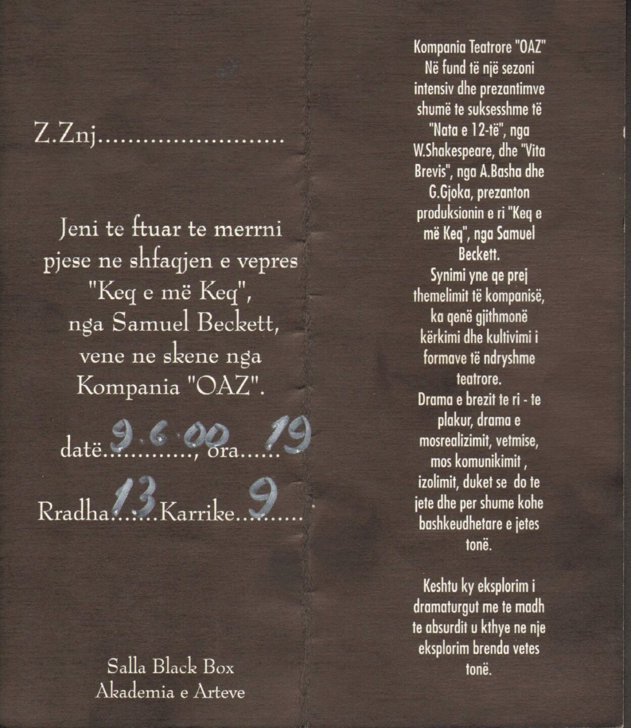 – ç’ishte një kompani teatrore në vitet 1995-2005: fryma, zgjedhja e pjesëve, autorëve, aktorëve, kontratat, shitja e biletave;